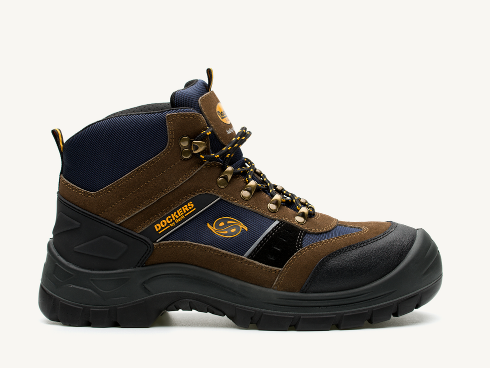 Blending urban style with industrial strength, the GIGA HIGH S3 safety shoe is designed for professionals who need serious protection without compromising on looks. Featuring a durable cow suede upper in sleek Black/Navy or warm Cognac/Navy tones, this mid-cut shoe brings both flair and function to the job. With a steel toe cap and steel midsole, it offers uncompromising safety against impacts and punctures. The dual-density PU/PU outsole ensures firm grip and shock absorption, while the breathable sandwich mesh lining and HI-POLY foam insole provide superior comfort through long shifts. Certified S3, SRC, and ESD, the GIGA HIGH is ideal for use in construction, industrial settings, logistics, and warehouse operations.